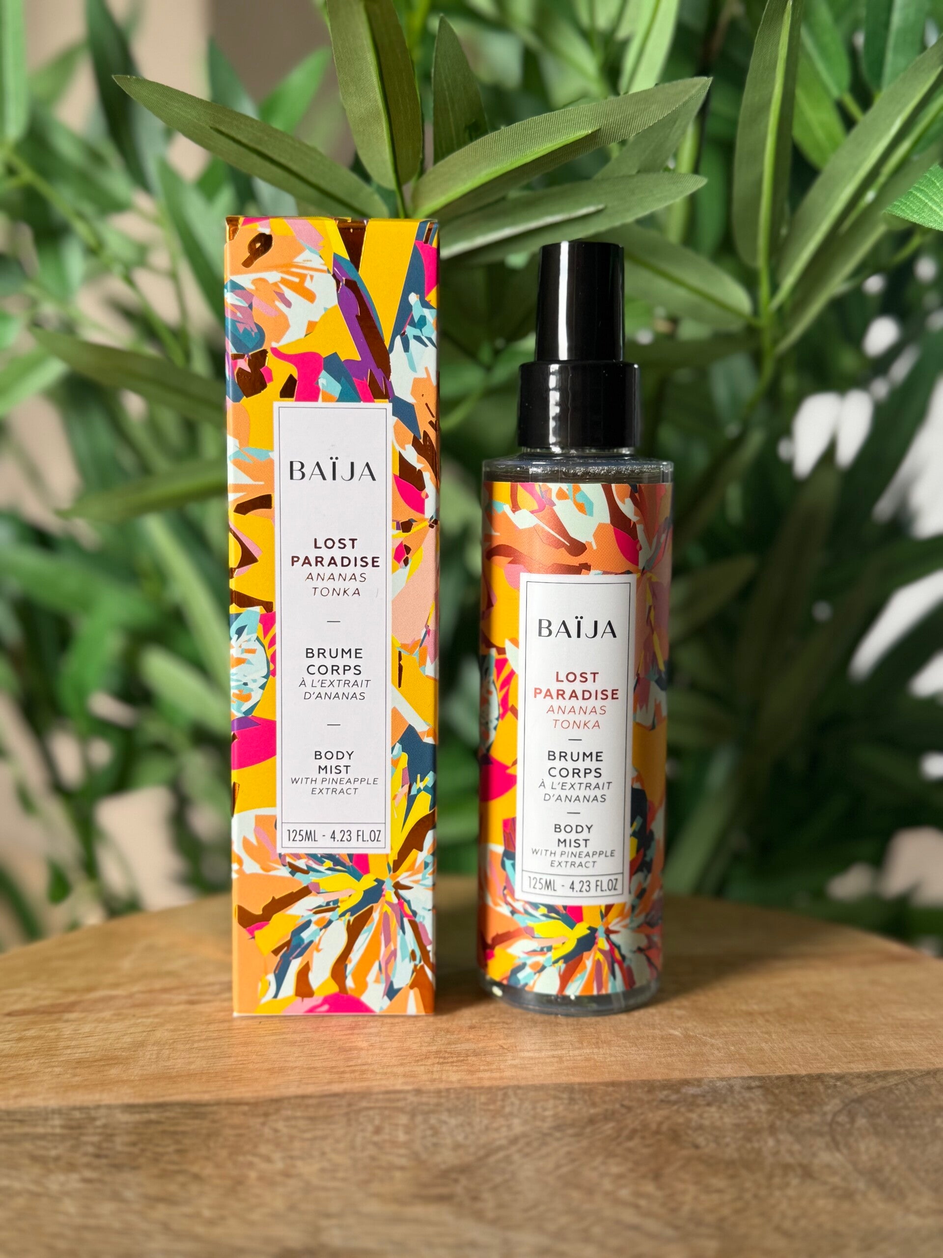 La brume corps Baija Lost Paradise à l'extrait d'ananas, mêlant ananas et fève tonka, offre une fragrance solaire et gourmande pour une peau subtilement parfumée.